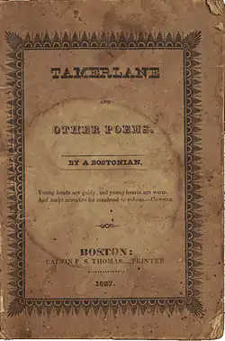 В родном городе Эдгар По волею случая познакомился с молодым издателем и типографом Кэлвином Томасом, и тот согласился напечатать его первый сборник стихов[41]. «„Тамерлан“ и другие стихотворения», написанный под псевдонимом «Бостонец», вышел в июне 1827 года[42]. Было напечатано 50 экземпляров, состоявших из 40 страниц, продавались они по 12,5 центов за штуку[43]. В 2009 году неизвестный коллекционер на аукционе приобрёл одну из дошедших до наших дней копий дебютного сборника Эдгара По, заплатив за него рекордную для американской литературы сумму — 662 500 долларов[44].