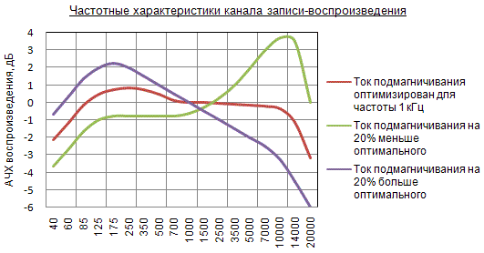 - минимальными нелинейными искажениями канала записи-воспроизведения на частоте 400 Гц.