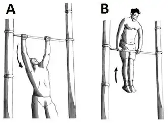 В этом упражнении задействованы различные мышцы, в основном, мышцы рук, груди и спины. В подтягивании используется бицепс и широчайшая мышца спины, для переноса кистей и отжимания на перекладине используются трицепсы и мышцы груди.