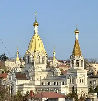 Пятикупольный храм базиликального типа. Над главным куполом — стрельчатый свод в окружении четырёх двенадцатигранных башенок. В западной части — колокольня, соединённая с храмом продолжением центрального объёма. Башенки и колокольня имеют шатровое покрытие, увенчанное маковками луковичной формы. Здание украшено рядами полукруглых кокошников, карнизы подчеркнуты лепными фризами. Построен собор из инкерманского и крымбальского камня[2].