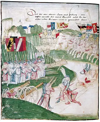 Битва швейцарцев с бургундцами при Грансоне (1476). Миниатюра «Бернской хроники» Диболда Шиллинга Старшего