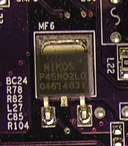 Мощный полевой транзистор (MOSFET) с каналом N-типа в SMD-корпусе, на материнской плате ПК.