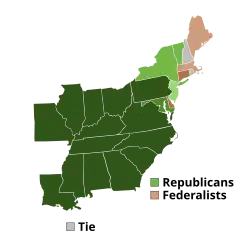 Постепенно влияние и мощь джефферсоновских республиканцев росли, в то время как элитарность их оппонентов отталкивала от них избирателей. Сокрушительный удар по федералистам был нанесён в середине 1810-х годов, когда они отказались поддержать Англо-американскую войну 1812—1815 годов, что поставило партию на грань раскола. Разгромное поражение оппозиции на выборах 1816 года и наступившая после него Эпоха добрых чувств (англ. Era of Good Feelings, 1816—1824) положили конец Первой партийной системе. Восемь лет, в течение которых одна партия практически безраздельно царила на политической сцене, привели к тому, что партийная дисциплина потеряла свою актуальность и республиканцы распались на несколько фракций[7].