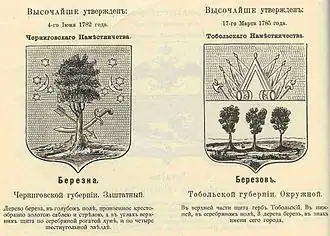 - Берёзов (1785) — «в серебряном поле три дерева берез, в знак имени сего города».
