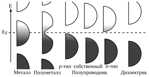 Диаграмма заполнения электронных уровней энергии в различных типах материалов в равновесном состоянии. На рисунке по высоте условно показана энергия, а ширина фигур — плотность состояний для данной энергии в указанном материале.