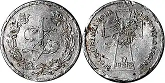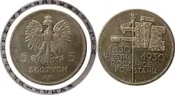 Во время Польского восстания 1830—1831 годов Национальное правительство с апреля по август 1831 года выпускало собственные «повстанческие» деньги — золотые червонцы, а также серебряные монеты достоинством 2 и 5 злотых с революционным гербом[18][19]. В условиях острого дефицита драгоценных металлов Польский банк, также попавший под контроль восставших, произвёл эмиссию бумажных банкнот достоинством 1 злотый. После поражения восстания решениями от 21 ноября (3 декабря) и 18 (30) декабря 1831 года все постановления революционного правительства в области денежного обращения были отменены. Отчеканенные им монеты подлежали изъятию из обращения и перечеканке, однако этот процесс растянулся на десятилетие — хождение революционных злотых было прекращено только в 1838 году[18].