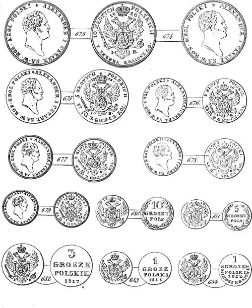 19 ноября (1 декабря) 1815 года был издан указ о монетной системе Царства Польского, находившегося в составе Российской империи, которым за злотым официально закреплялся статус основной денежной единицы, но устанавливался его фиксированный курс к рублю: 1 злотый равен 15 копейкам серебром, а 1 грош, который по-прежнему соответствовал 1/30 злотого, — ½ серебряной копейки. В том же году на Варшавском монетном дворе после долгого перерыва была начата чеканка монет, номинированные в грошах и злотых с легендой на польском языке и изображением российского герба и/или профиля Александра I[19]: