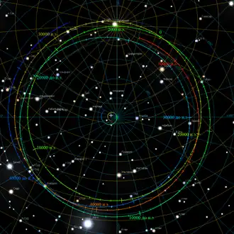 Смещение северного полюса на фоне неподвижного неба эпохи J2000.0 при лунно-солнечной и планетной прецессии[20] для интервала времени от 48000 г. до н. э. до 52000 г. н. э.[21]. Что показывает соответствующую смену полярных звёзд.