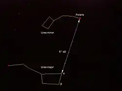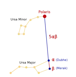 Чтобы найти Полярную звезду, надо сначала найти характерную конфигурацию из семи ярких звёзд — созвездие Большой Медведицы, напоминающее ковш (астеризм Большой Ковш), затем через две звезды (Дубхе и Мерак) «стенки» ковша, противоположной «ручке», мысленно провести линию, на которой отложить пять раз расстояние между этими крайними звёздами. Примерно в конце этой линии находится Полярная звезда. Направление на Полярную звезду совпадает с направлением на север, а её высота над горизонтом совпадает с широтой наблюдателя.