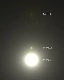 Вид на Полярную звезду в небольшой телескоп. Полярная B отделена от главной звезды, Полярной A, 18 угловыми секундами
