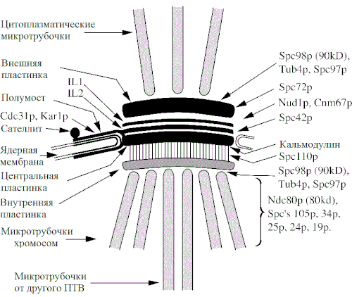 N-Конец Spc110 локализован во внутренней пластинке и связан непосредственно с Spc98, одним из двух похожих у-тубулин-связанных белков, необходимых для образования микротрубочек. С-Конец Spc42 обращен в цитоплазму и связан с С-концом Cnm67. Сходно с Spc110, спирально закрученный участок Cnm67 способствует его димеризации и функционированию между внутренними слоями IL2 и IL1. N-Конец белка Cnm67 связан с наружной пластиной ПТВ и белком Nudl, необходимым для выхода из митоза. Другой спирально закрученный белок Spc72 также обнаружен в наружной пластинке. Spc72 связан с Nudl и с компонентами γ-тубулинового комплекса.