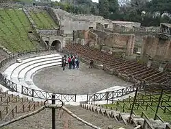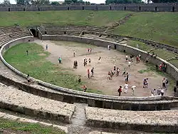 Амфитеатр в Помпеях, вмещавший 20 000 зрителей, был построен около 80 года до н. э. одновременно с малым театром теми же дуумвирами. Имеет размеры 135 на 104 м и в настоящее время является древнейшим известным амфитеатром. Отличается от остальных тем, что входы в него находились в верхней части зрительного зала, а также отсутствием подвальных помещений: выход гладиаторов на арену осуществлялся через коридор прямо с улицы. Через второй коридор выносили раненых и убитых.