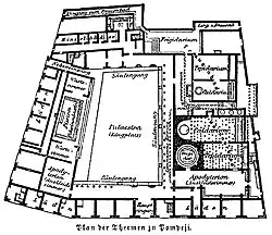 Большая палестра была построена в римскую эпоху, когда Самнитская палестра перестала отвечать потребностям растущего города. Предназначалась для гимнастических упражнений и спортивных мероприятий. Представляла собой площадь 130 на 140 м, окружённую с трёх сторон портиком с ионическими колоннами. Четвёртая сторона выходила на амфитеатр, где находились входы в палестру, разрушенные землетрясением 62 года и восстановленные в технике opus latericium. В центре находился бассейн (37 на 40 м) глубиной от 1 м на западе до 3 на востоке. В южной части — туалеты, очищаемые водой бассейна. Северная стена рухнула при катастрофе 79 года и была восстановлена археологами.