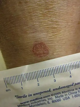 Проявляется мелкими диффузными красноватыми папулами. Локализуется на коже пальцев, ладоней и подошв.
