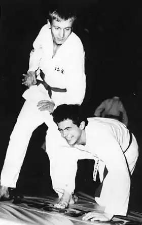 ![]() Тренировка по каратэ в Сюри. Ученики находятся в стойке дзэнкуцу-дати. |