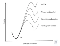 На этой стадии интермедиат (карбокатион) является более неустойчивым, чем исходный галогенид, поэтому переходное состояние является поздним и по структуре напоминает этот карбокатион. Если сравнивать устойчивость карбокатионов, образующихся из метилгалогенидов, первичных, вторичных и третичных галогенидов, то в этом ряду устойчивость будет повышаться, а их энергия понижаться. Но поскольку переходные состояния напоминают по структуре карбокатионы, то их энергия будет близка к энергии соответствующих карбокатионов и будет изменяться с той же тенденцией. Таким образом, постулат Хэммонда позволяет получать информацию о переходных состояниях, не имея реальных данных об их строении[4].