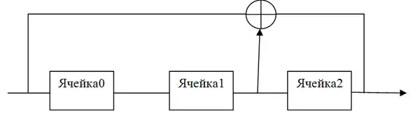 - новое содержимое ячейки определяется битом обратной связи, который вычисляется сложением по модулю 2 с определёнными коэффициентами битов ячеек .