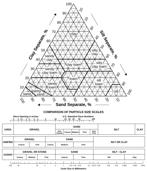 В мире также широко применяется определение механического состава почвы по треугольнику Ферре: по одной стороне откладывается доля пылеватых (silt, 0,002—0,05 мм) частиц, по второй — глинистых (clay, <0,002 мм), по третьей — песчаных (sand, 0,05—2 мм) и находится место пересечения отрезков. Внутри треугольник разбит на участки, каждый из которых соответствует тому или иному гранулометрическому составу почвы. Тип почвообразования при этом не учитывается.