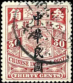 Революция 1911 года привела к появлению надпечаток на марках императорского Китая в 1912 году. Надпечатки были сделаны в Фучжоу (Sc #134—137) для указания на то, что данное почтовое отделение является нейтральной зоной, доступной для обеих сторон. Надпечатки в Нанкине (Sc #138—145) и Шанхае (Sc #146—162) содержали текст на китайском языке «Китайская Республика». Дополнительный комплект надпечаток был сделан фирмой Waterlow and Sons в Лондоне (Sc #163—177). Кроме того, почтмейстеры по всей стране изготовляли собственные неофициальные надпечатки с таким же текстом.