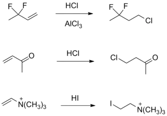 Вскоре после публикации правила Марковникова стали известны примеры, когда присоединение к алкенам достаточно простого строения приводило к неверному результату (анти-марковниковским продуктам) даже при низкой температуре. В то время, как эмпирическое правило Марковникова неспособно объяснить данные исключения, рассмотрение механизма позволяет достаточно просто показать, что образование таких продуктов согласуется с относительной устойчивостью карбокатионов[5].