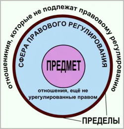 Посредством права невозможно урегулировать абсолютно все общественные отношения, поэтому должна быть достаточно точно определена сфера их регулирования[8]. В сферу правового регулирования должны входить все те отношения, которые уже урегулированы правом — они составляют собственно предмет, а также те, которые только нуждаются в таком регулировании.
