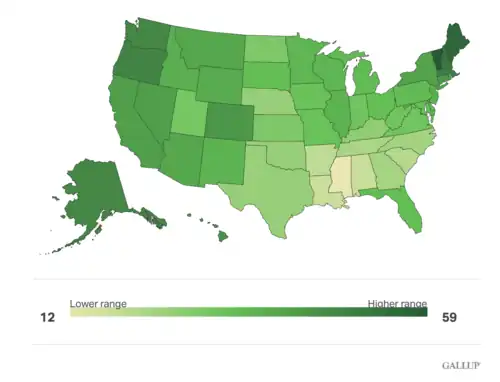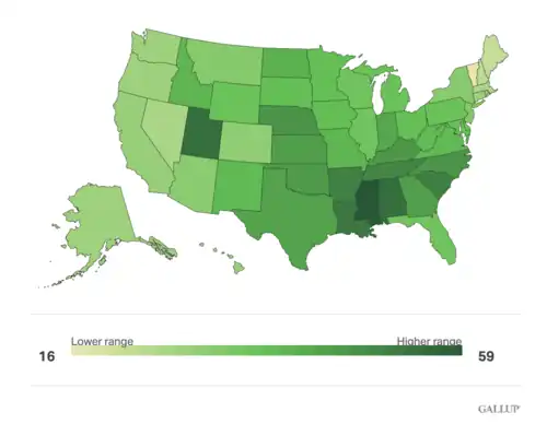Институт Gallup делит население Соединенных Штатов на три категории: «очень религиозные» (37 %), «умеренно религиозные» (30 %) и «нерелигиозные» (33 %)[2]. Самыми религиозными штатами США являются Миссисипи (59 %), Юта и Алабама (по 54 %), в категории «нерелигиозных» штатов первые строчки занимают Вермонт (59 %), Мэн (55 %) и Нью-Гэмпшир (51 %), а «умеренно религиозными» являются Нью-Джерси, Невада и Джорджия (по 33 %)[2]. Согласно исследованию Pew Research Institute 2014 г., самым религиозным штатом в США является Алабама, а наименее религиозным по суммарному индексу — Нью-Гэмпшир и Массачусетс. По параметру веры в Бога лидируют Алабама, Миссисипи и Теннесси. Ниже приведена таблица с результатами опроса Pew Research Institute[5]: