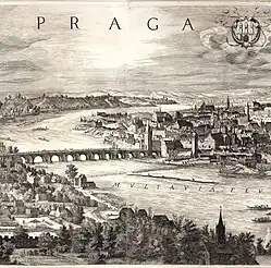 Однако в 1618 году знаменитая вторая дефенестрация Праги привела к Тридцатилетней войне, которая была особенно тяжелым периодом для Праги и Чехии. Фердинанд II Габсбургский был свергнут, и его место на посту короля Богемии занял Фридрих V, курфюрст Палатин. Однако его армия была разбита в битве у Белой Горы (1620 г.) недалеко от города. После этого в 1621 году 27 чешских протестантских лидеров, участвовавших в восстании, были казнены на Староместская площадь, а многие другие были сосланы. Прага была насильственно обращена обратно в католицизм, а затем и остальные чешские земли. Впоследствии город пострадал во время войны от нападения курфюрста Саксонии (1631 г.) и во время Пражской битвы (1648 г.). В Праге начался неуклонный упадок, в результате которого население сократилось с 60 000 до войны до 20 000 человек. Во второй половине 17 века население Праги снова начало расти. Евреи жили в Праге с конца 10 века, и к 1708 году они составляли около четверти населения Праги[20].