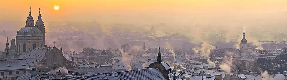 Между серединой октября и серединой марта в Праге обычны температурные инверсии, что может привести к туманным и холодным дням с умеренным загрязнением воздуха. В городе также ветрено, с обычными устойчивыми западными ветрами и средней скоростью ветра 16 км / ч, что часто помогает сломать температурные инверсии и очистить воздух в холодные месяцы.