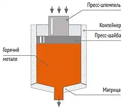 Прессование представляет собой процесс выдавливания помещенной в контейнер заготовки через отверстие в матрице усилием пресс-штемпеля (пуансона), снабженного пресс-шайбой. В случае прессования полых заготовок, в том числе труб, оснастка дополняется иглой, закрепленной либо на пуансоне, либо в иглодержателе, имеющем независимый привод. Форма матрицы определяет форму профиля получившегося изделия.