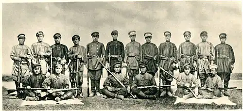 Конвой 4-й экспедиции Н. М. Пржевальского. Сидят (слева направо): Нефедов, Иванов, Перевалов, Соковников, Полуянов, Юсупов. Стоят (слева направо): Иринчинов, Безсонов, Добрынин, Дорджеев, Хлебников, Блинков, Протопопов, Телешов, Родионов, Жарников, Жаркой, Максимов. Фото В. И. Роборовского.