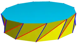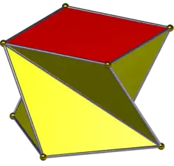 Скрученная призма — это невыпуклый призматический многогранник, полученный из однородной q-угольной путём деления боковых граней диагональю и вращения верхнего основания, обычно на угол радиан ( градусов), в направлении, при котором стороны становятся вогнутыми[3][4].
