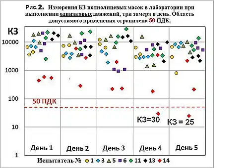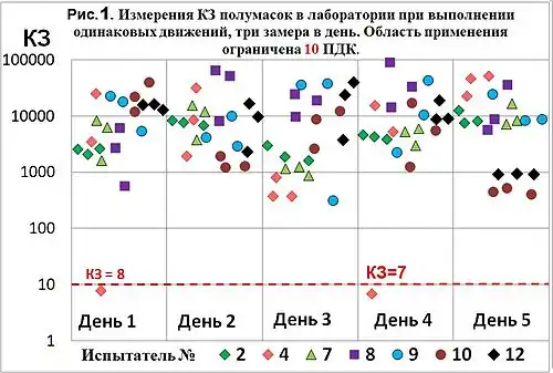 В исследовании[2] измерялись коэффициенты защиты респираторов — полумаски и полнолицевой маски — при носке респираторов одними и теми же людьми в лаборатории при выполнении одинаковых движений (Рис. 1 и 2). Выполнялось три замера каждый день. У некоторых испытателей коэффициенты защиты (отношение средней концентрации аэрозоля снаружи маски к средней концентрации под маской) очень разнообразны, и иногда они большие, а иногда — маленькие.