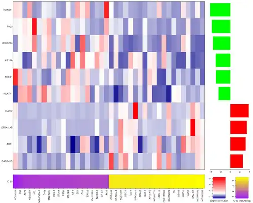 Второй подход — применение штрафной функции «elastic net». Данные, анализируемые с помощью данной штрафной функции, помимо подаваемых MANOVA, включают полногеномные транскрипционные профили и типы тканей. Функция «elastic net» определяет характеристики, связанные с определённым ответом на препарат (значением IC50) той или иной клеточной линии. Данные представляются в виде «elastic net plot» — тепловой карты и гистограммы. Тепловая карта отображает мутации 20 наиболее устойчивых и 20 наиболее чувствительных к данному препарату клеточных линий. Цвета карты отображают экспрессию и копийность (синий — низкая, красный — высокая). Гистограмма показывает изменение чувствительности к препарату, соответствующее мутации (увеличение — красный, снижение — зелёный)[15].