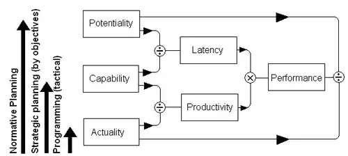где — максимально достижимый в данных природных условиях на данном уровне развития цивилизации выпуск продукции в единицах измерения данного вида продукции (потенциальная выработка), — минимально необходимые в данных природных условиях на данном уровне развития цивилизации затраты живого труда в единицах времени (потенциальная трудоёмкость).