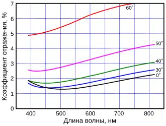 Так как длина пути света в плёнке зависит от угла падения, при косом падении минимум коэффициента отражения смещается в сторону более коротких длин волн и одновременно увеличивается. Казалось бы, что увеличение длины пути света в плёнке при косом падении должно смещать минимум в сторону более длинных волн, но это не так. Более тонкий учёт взаимодействия волнового фронта с плёнкой приводит к наблюдаемому смещению минимума в сторону более коротких волн, как показано на рисунке[1].