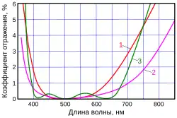 Но отражательная способность стекла, просветлённого таким способом, сильно зависит от длины волны, что является основным недостатком однослойного просветления. Минимум отражательной способности соответствует четверти длины волны в материале плёнки.