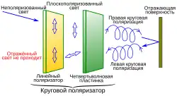 Принцип действия такого антибликового покрытия основан на применении круговой поляризации света[4][5]. Круговой поляризатор состоит из обычного линейного поляризатора и четвертьволновой пластинки (четвертьволновую пластинку не следует путать с четвертьволновым интерференционным слоем). Четвертьволновая пластинка преобразует проходящий через неё плоскополяризованный свет в свет с круговой поляризацией, и наоборот, свет с круговой поляризацией - в плоскополяризованный свет. Внешний неполяризованный свет, проходя через линейный поляризатор, превращается в плоскополяризованный свет, а после четвертьволновой пластинки - в свет, поляризованный по кругу. Этот свет, отразившись от поверхности, блики от которой нужно устранить, меняет хиральность на противоположную, то есть, если направление вращения света с круговой поляризацией было направлено до отражения по часовой стрелке, то после отражения направление вращения становится противоположным. Это отражённое излучение, повторно пройдя через четвертьволновую пластинку, вновь становится плоскополяризованным, но плоскость поляризации его повёрнута относительно падающего света за линейным поляризатором на 90° и поэтому не проходит наружу через плоскополяризующий поляризатор.