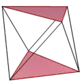 Многоугольники Петри — это правильные пространственные многоугольники, задаваемые внутри правильных многогранников и политопов. Например, 5 платоновых тел содержат 4, 6 и 10-сторонние правильные пространственные многоугольники, как видно из этих ортогональных проекций (красными отрезками показана проективная оболочка). Тетраэдр и октаэдр включают все вершины в зигзаг-многоугольника и могут рассматриваться как антпризмы отрезков и треугольников соответственно.