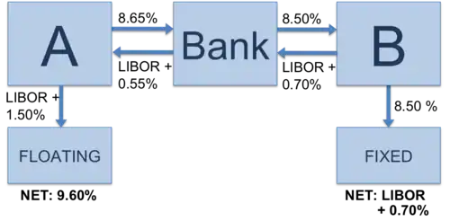 Рисунок: А получает фиксированный доход 8,65 %, а платит LIBOR+1.50 %. А хочет оба потока привести к виду LIBOR+. А заключает своп с В — «перенаправляет ему доход 8,65 %» (в реальности не весь, а только сальдо «неттинг» — разницу между 8,65 % и LIBOR+0,70 %) и «получает доход LIBOR+0.70 %». Так как доход с актива на рисунке не отображен в явном виде, это может вводить в заблуждение.