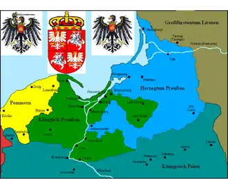 В 1525 году Великий Магистр Тевтонского Ордена Альбрехт Бранденбургский, перейдя в протестантизм, по совету Мартина Лютера секуляризовал земли Тевтонского ордена в Пруссии, превратив их в светское герцогство, находящееся в ленной зависимости от Польши.