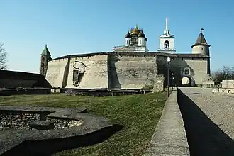 Постоянная опасность, грозившая Пскову с запада, вынуждала укреплять и развивать крепость. Территория кремля была значительно расширена во время правления князя Довмонта. Возможно, что в это время деревянные стены начали заменять каменными. По его приказу была построена каменная стена, проходящая от берега Псковы к берегу Великой[27].