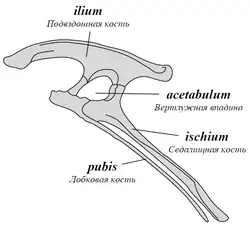 Таз имел четырёхлучевое строение. Лобковая кость имела вырост, направленный назад вдоль седалищной кости (у ящеротазовых кости были практически перпендикулярны). Лобковая кость часто образует новый вырост, направленный вперёд параллельно позвоночнику. Подобное строение таза развивалось у динозавров независимо трижды: у птицетазовых, у надсемейства теризинозавроиды и семейства дромеозавриды. Последнее и является наиболее вероятным предком птиц.