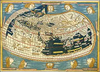 Всемирная карта Птолемея, изданная Николаем Германусом в 1482 году на основании карты Якобуса Анжелуса 1406 года, составленной по греческим рукописям, переведённым на латинский язык Максимом Планудом в конце XIII века