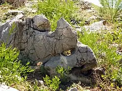 Поверхность плато, прилегающая к юго-западному борту, покрыта каменной россыпью причудливо выветренных форм[4]. Размер обломков — от нескольких сантиметров до двух метров и более. Они сложены серыми и тёмно-серыми известняками, реже — доломитами. При раскалывании обломки издают резкий неприятный запах, похожий на запах сероводорода. Тёмно-серая (почти до чёрной) окраска и резкий неприятный запах обусловлены значительной примесью захороненного в них органического вещества.