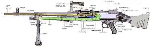 Действие автоматики большинства современных пулемётов основано на использовании отвода пороховых газов через отверстие в стенке ствола, реже применяется отдача ствола при его коротком ходе (в основном, в пулемётах более старых образцов). Питание пулемёта патронами производится из ленты или магазина. Стрельба из пулемёта может вестись короткими (до 10 выстрелов), длинными (до 30 выстрелов) очередями, непрерывно, а у некоторых пулемётов — ещё и одиночным огнём или очередью фиксированной длины. В современных пулемётах охлаждение ствола, как правило, воздушное[3] , но в прошлом широко использовалось водяное. Для ведения прицельной стрельбы пулемёты снабжаются прицелами (механическими, оптическими, ночными). Расчёт пулемёта состоит из одного, двух и более человек (в зависимости от характеристики пулемёта).