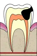 Пульпит — воспаление внутренних тканей зуба (пульпы). Пульпа находится внутри зубного канала и содержит нерв, сосуды, клетки соединительной ткани и обеспечивает питание твердых тканей зуба изнутри[3]. Пульпит развивается при попадании внутрь зуба инфекции, чаще всего в результате длительно текущего кариеса. Обычные проявления — повышенная чувствительность зуба к температуре, пульсирующая боль[4], возможно и бессимптомное течение[5]. В зависимости от длительности течения может быть острым и хроническим.