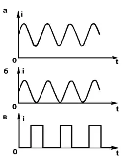 Различные пульсирующие токи отличаются друг от друга формой (если напряжение никогда не уменьшается до нуля), а также длительностью и частотой импульсов (если в некоторые периоды времени ток отсутствует) и зависит от того каким образом его получили из переменного, либо на инверторе из постоянного.