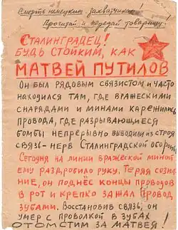 - ↑ ЛЕГЕНДАРНЫЕ РАДИСТЫ-СВЯЗИСТЫ СТАЛИНГРАДА Архивная копия от 19 апреля 2012 на Wayback Machine у генерала Дятленко сохранились карты боёв с указанием места гибели Матвея Путилова