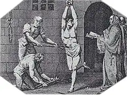 - ↑ англ. Two old priests showing the application of torture under the supervision of the Inquisition