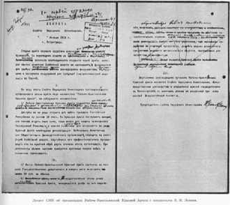 Совѣтъ Народныхъ Комиссаровъ постановляетъ: организовать новую армію подъ названіемъ «Рабоче-Крестьянская Красная Армія», на слѣдующихъ основаніяхъ: